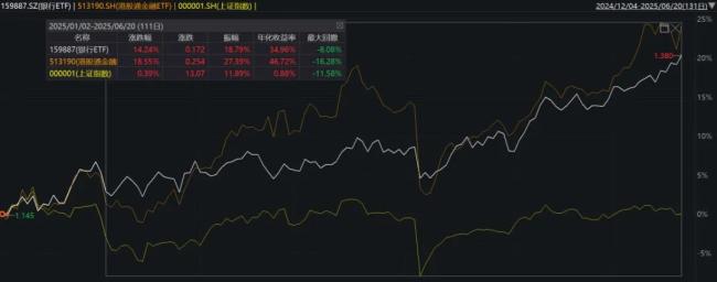与上证指数对比,截至6月20日(今年以来),A股银行ETF涨幅14.2%,港股通金融ETF涨幅18.6%,同期上证指数仅微涨0.4%。银行板块相对于大盘指数的超额收益明显。