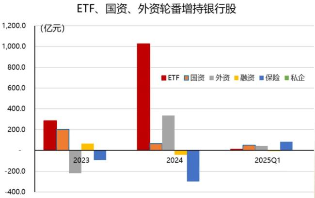 从板块资金流入来看,2023年ETF和国资是流入银行板块最大的资金。2024年,ETF爆发式流入,与此同时,国资和外资对银行板块继续增配。2025Q1,国资和外资保持净流入的情况下,险资扭转净流出态势,对银行板块大幅增配。