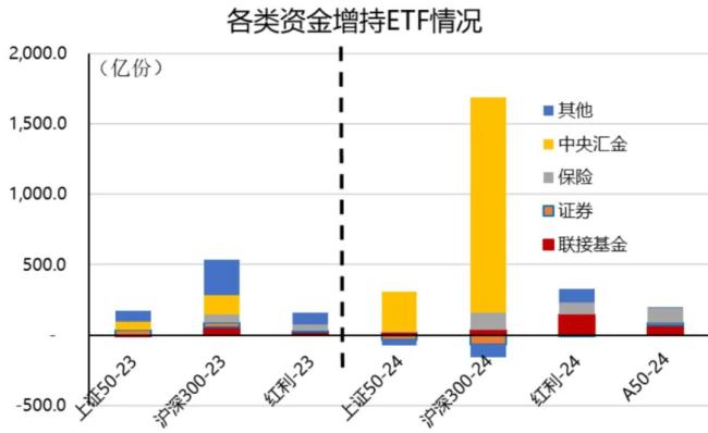 这里的ETF主要包括沪深300ETF、A50ETF等宽基指数ETF和红利ETF,而这些ETF的持有人中,近两年中央汇金主要增持的是沪深300ETF和A50ETF,险资则主要增持红利ETF和A50ETF。