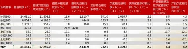 其中以沪深300为业绩基准的产品欠配银行股金额最高,为1070亿元;其次为以中证800为业绩基准的产品,欠配银行股291亿元。