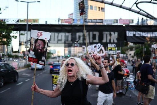 7月6日,民众在以色列特拉维夫举行游行集会,要求政府迅速在加沙地带实现永久停火,与巴勒斯坦伊斯兰抵抗运动(哈马斯)达成协议,让被扣押人员尽快获释。新华社发(贾马尔·阿瓦德摄)