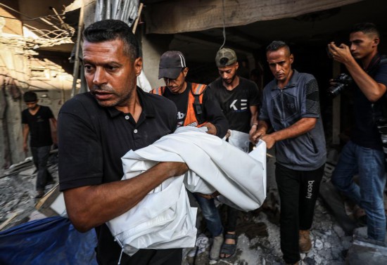 7月6日,巴勒斯坦人在加沙城搬运遇难者遗体。新华社发(马哈茂德·扎基摄)