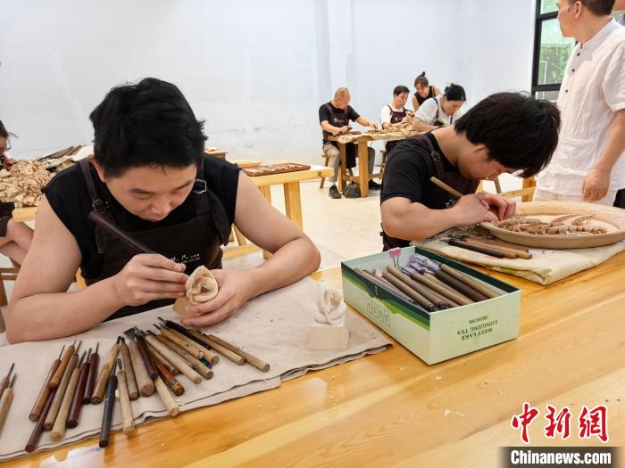 中新网金华7月10日电(张煜欢)走进位于浙江金华东阳木雕小镇的胡先民工作室,在刻刀与木料摩擦的沙沙声里,全国自强模范、浙江省工艺美术大师胡先民俯身于听障学徒张真飞旁,帮其细致调整切削力道。一刻一凿间,木屑簌簌飘落,一片片祥云打磨而出,师徒俩沉浸于手中的方寸天地。