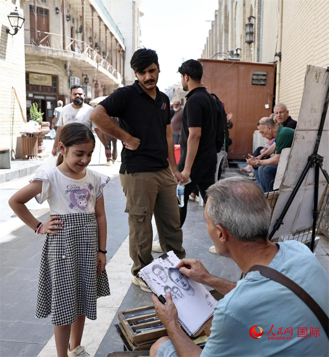 一名街头艺术家在给一名小女孩画像。人民网 伊纳斯·易卜拉欣摄