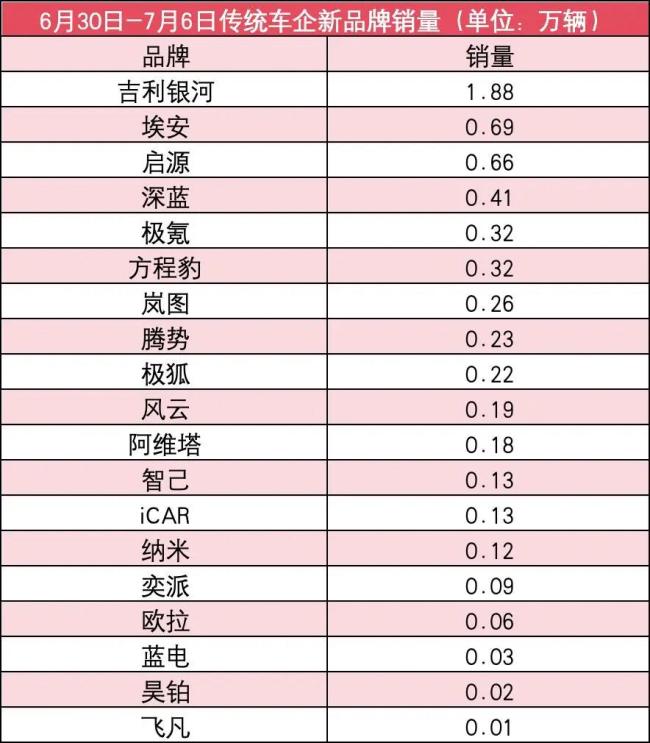 而在传统车企新品牌方面,上周销量也基本上是下滑。其中,吉利银河长期稳居第一,上周销量为1.88万辆,较前一周下滑了0.6万辆;这也是传统车企新品牌中唯一周销量过万的。埃安为0.69万辆,较前一周下滑了0.04万辆;紧随其后的是启源,其销量为0.66万辆,较前一周下滑了0.29万辆。