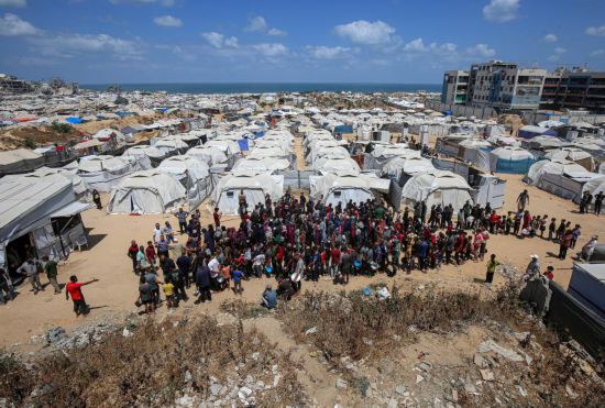 5月28日,人们在加沙城西部的沙提难民营等待领取救助食物。新华社发(里泽克·阿卜杜勒贾瓦德摄)