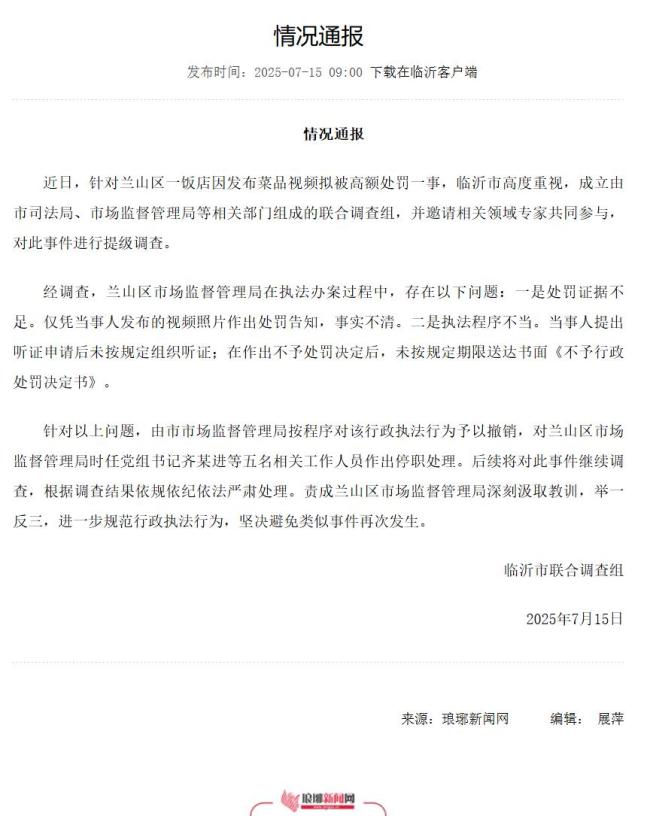 经调查,兰山区市场监督管理局在执法过程中存在证据不足和程序不当的问题。仅凭当事人发布的视频照片作出处罚告知,事实不清。此外,当事人提出听证申请后未按规定组织听证;在作出不予处罚决定后,也未按规定期限送达书面《不予行政处罚决定书》。因此,市市场监督管理局按程序对该行政执法行为予以撤销,对兰山区市场监督管理局时任党组书记齐某进等五名相关工作人员作出停职处理。后续将继续调查此事,并根据结果依规依纪依法严肃处理。兰山区市场监督管理局也被要求深刻汲取教训,进一步规范行政执法行为,避免类似事件再次发生。