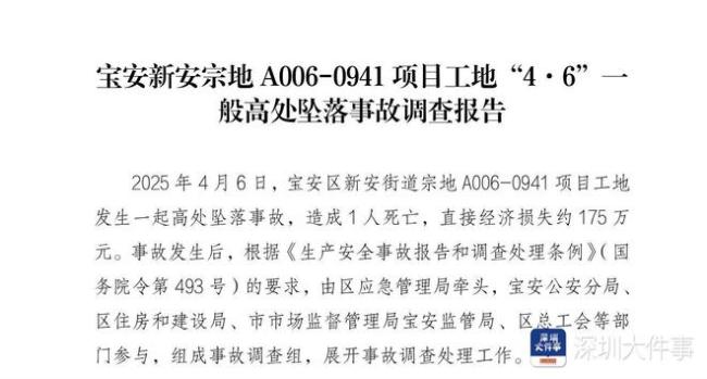 近日,深圳市宝安区人民政府正式官网公布了《宝安新安宗地A006-0941项目工地“4・6”一般高处坠落事故调查报告》。调查报告显示,2025年4月6日,宝安区新安街道宗地A006-0941项目工地发生一起高处坠落事故,造成1人死亡,直接经济损失约175万元。调查组认定,本起事故是一起因工人违反施工方案作业,施工现场安全管理不到位而造成的一般生产安全责任事故。