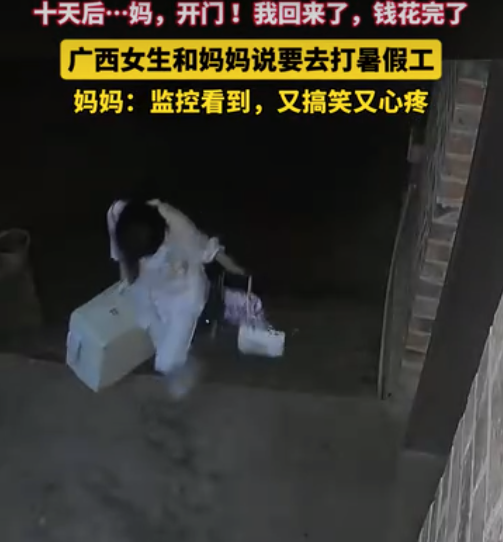 广西某女生暑假期间声称外出打工,仅10天后便花光携带的500元资金,未找到工作即返家。监控显示其返家时携带行李,妈妈:又搞笑又心疼。