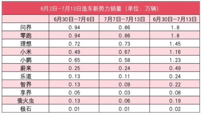 新势力7月第2周销量榜:咋了?无一过万,仅理想、小米增长