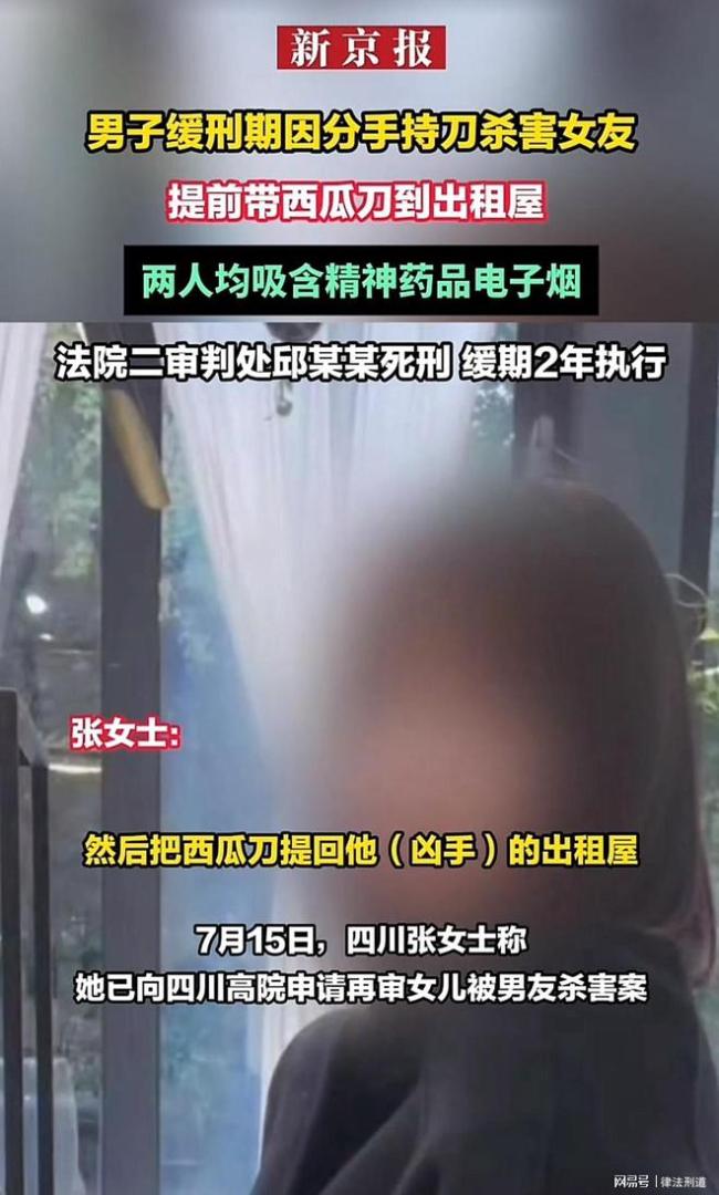男子缓刑期杀害女友被判死缓 家属申请再审引发关注!2025年7月15日,四川张女士向四川高院申请再审女儿被男友杀害案,再次引起公众关注。2023年7月,张女士的女儿因想与男友邱某某分手,在出租屋内被杀害。事发前,邱某某将一把西瓜刀带入出租屋,并且两人还吸食了含有精神类药品的电子烟。判决书显示,邱某某曾因寻衅滋事罪被判处缓刑,案发时正处于缓刑期间。