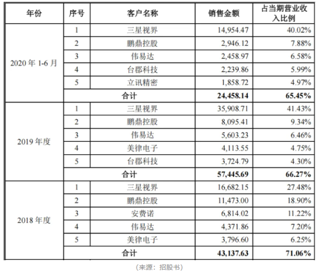 基于长期积累,公司客户资源较为丰富,直接客户包括三星视界、鹏鼎控股、安费诺、歌尔股份、立讯精密等消费电子零组件生产商,产品最终应用于苹果、华为、OPPO、Jabra、Sony、Facebook等终端品牌。