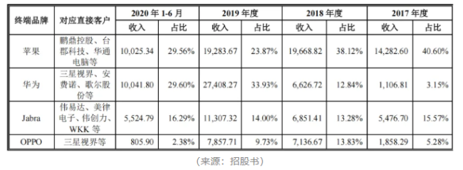 从公司产品终端品牌来看,苹果、华为、Jabra(丹麦耳机品牌商)贡献的收入比重较高,三者基本贡献了公司60%以上的收入。