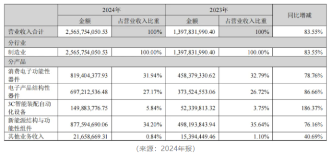 2024年,消费电子终端需求回暖带动公司消费电子业务营业收入增长,叠加新能源组件业务高增长,公司营收同比增长83.6%。2025年一季度,营收同比增长45.4%。