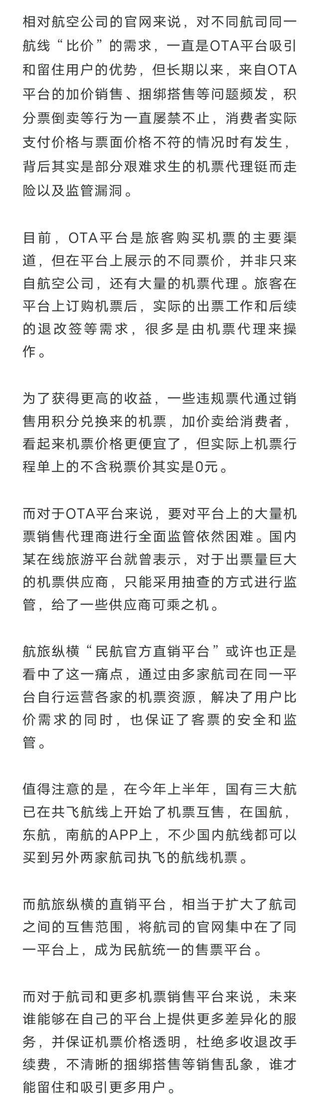 “民航版12306”来了 一站式机票直销平台。近日,国内最大的民航信息服务平台航旅纵横的APP首页上出现了“民航官方直销平台”的字样。不少旅客认为这家以航班动态查询起家的平台开始发力机票销售业务,类似于民航版的12306。