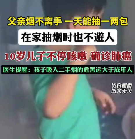 7月25日(发布),郑州一10岁男孩因为不停咳嗽,去医院检查时发现肺部肿瘤,确诊肺癌早期。医生追问病史发现,孩子父亲烟瘾极大,一天能抽一两包,在家抽烟时也不避人。孩子正处于告诉生长发育期,基因、细胞不断分裂增值,长期吸入二手烟,极易造成基因突变,诱发癌症。好在经过治疗,孩子正在康复中。