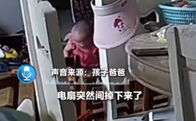7月29日,安徽阜阳,家中电风扇突然坠落,万幸1岁宝宝刚刚爬离危险区域,孩子爸爸:很后怕,风扇年久失修导致。