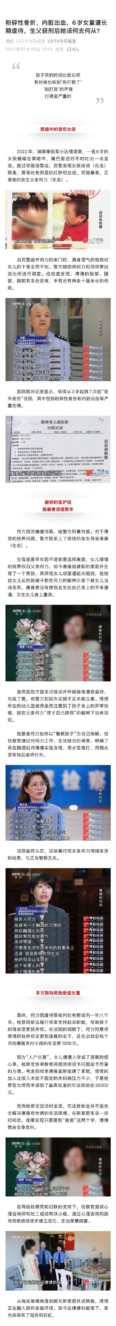 2022年,在湖南衡阳某小区楼道里,一名6岁的女孩蜷缩在黑暗中,嘴里不时吐出血泡。邻居发现后报警,民警到场发现女孩倩倩眼角、眉骨处有明显的红肿和血迹。施暴者是她的亲生父亲何力。