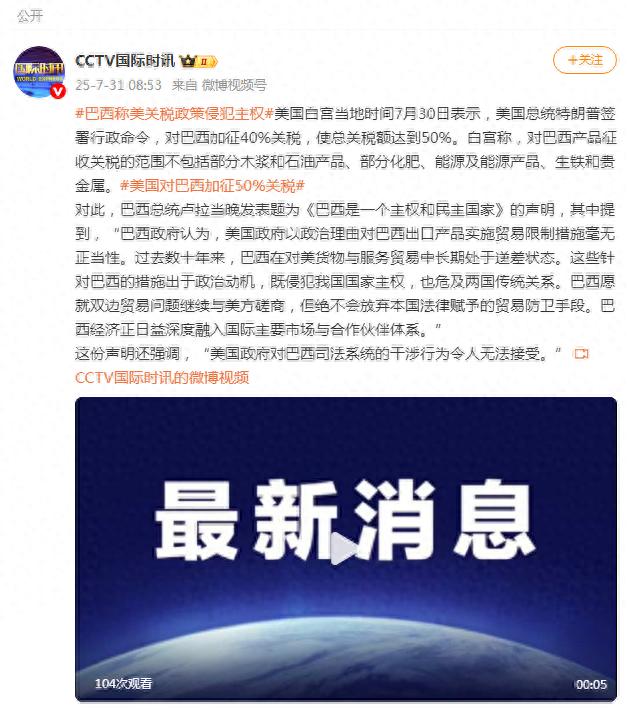 对此,巴西总统卢拉当晚发表题为《巴西是一个主权和民主国家》的声明,其中提到,“巴西政府认为,美国政府以政治理由对巴西出口产品实施贸易限制措施毫无正当性。过去数十年来,巴西在对美货物与服务贸易中长期处于逆差状态。这些针对巴西的措施出于政治动机,既侵犯我国国家主权,也危及两国传统关系。巴西愿就双边贸易问题继续与美方磋商,但绝不会放弃本国法律赋予的贸易防卫手段。巴西经济正日益深度融入国际主要市场与合作伙伴体系。”