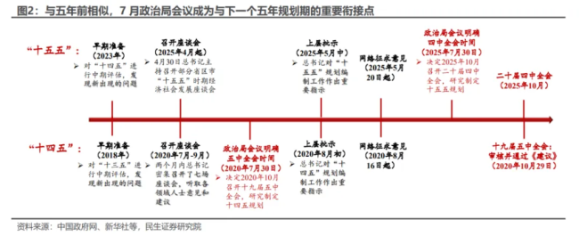 与“十五五”的衔接如期而至,五年间中国应对复杂局面的战略思维有了显著提升。本次会议预告了全会的召开,10月将审议“十五五”规划《建议》。当前对风险挑战的认知深度增强,描述为“战略机遇和风险挑战并存、不确定难预料因素增多”,强调了风险感知的程度和不可预测性。
