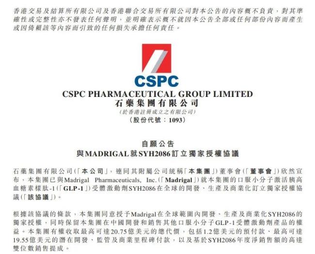 2025年7月30晚获悉,石药集团发布公告,称集团已与Madrigal Pharmaceuticals,Inc.(下称Madrigal)就本集团的口服小分子GLP-1受体激动剂SYH2086在全球的开发、生产及商业化订立独家授权协议。