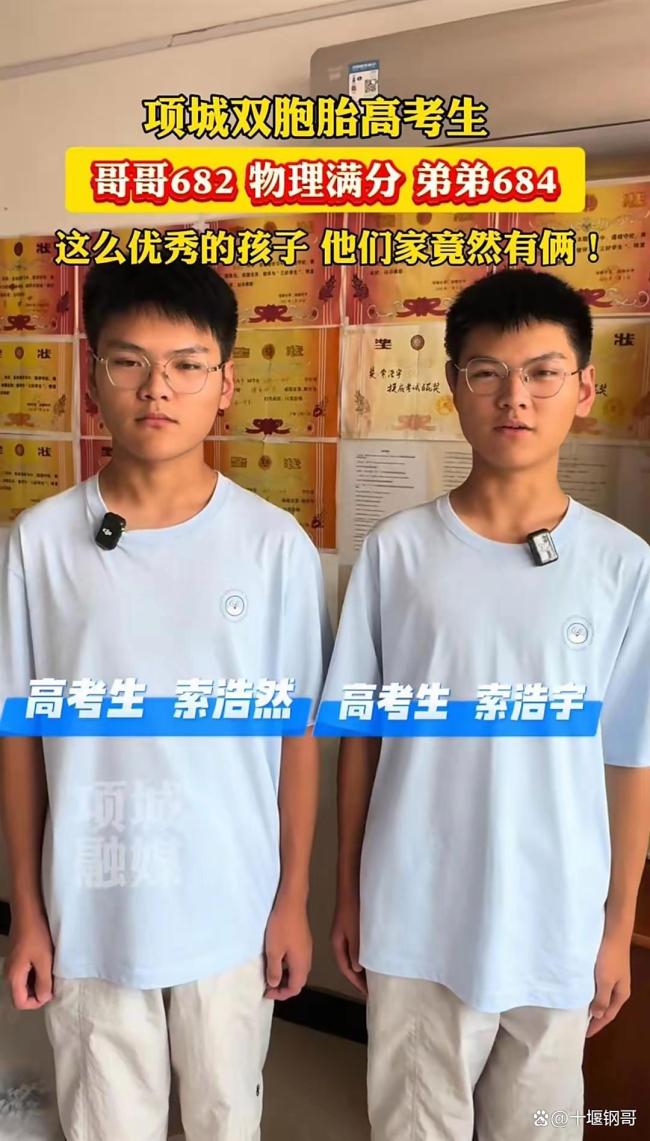 河南省项城市的一对双胞胎兄弟索浩宇和索浩然分别收到了来自哈尔滨工业大学和西安交通大学的录取通知书。这对18岁的兄弟高中均就读于项城市第一高级中学。今年高考,哥哥索浩宇考了682分,其中物理取得了满分的好成绩;弟弟索浩然则以684分的成绩略胜一筹,比哥哥高出2分。两人分别被西安交通大学和哈尔滨工业大学录取,这两所大学同属C9联盟。