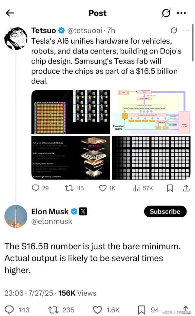 结语:德州的“芯片革命”,能否改写历史?特斯拉与三星的 165 亿美元交易,不仅是一家车企的技术选择,更是美国重塑半导体霸权的关键一步。尽管特斯拉销量下滑的阴影仍在,但 AI6 芯片的战略价值,或许能让马斯克再次创造 “不可能”。正如他所言:“我们正在做的,是改变人类未来的事情。”有外媒网友热情地对此评价:当三星德州工厂的第一批 AI6 芯片下线时,或许我们会看到:那个曾经依赖亚洲制造的美国,正在马斯克的带领下,重新定义全球芯片的未来。而这场革命的起点,正是德州泰勒小镇的那座超级工厂 —— 那里闪烁的,不仅是芯片的光芒,更是一个国家对技术主权的渴望。当然,前提是马斯克的商业帝国不能跨……