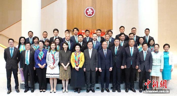 7月29日,香港特区行政长官李家超(前排左七)在特区政府总部会晤香港中华联谊会会长郑翔玲(前排左六)等联谊会主要成员。(主办方供图)