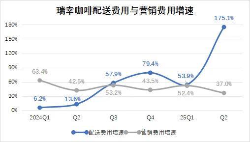 成本侧,尤其是三费方面,仅有配送费用大增。截至6月30日,瑞幸单季度配送费用从6.1亿元增至16.7亿元,同比大增175.1%。