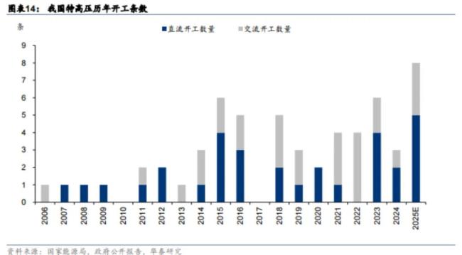 如今“十四五”来到收官阶段,特高压建设节奏有明显提速。根据华泰证券的预测,2025年内有望开工5至6条直流线路、3至4条交流线路,合计8-10条的规模是历年之最。