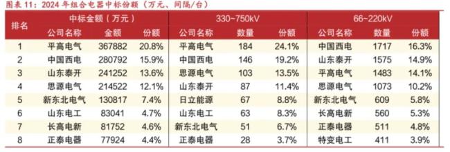 此前2024年的6次招标中,思源电气在组合电器分标的中标金额为21.45亿,以12.1%的市场份额排在行业第四,落后于平高电气(600312.SH)、中国西电(601179.SH)以及山东泰开。