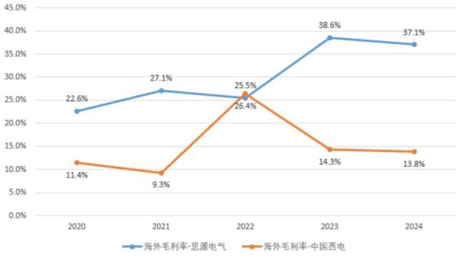2024年,思源电气出海毛利率高达37.1%,明显高于同期内销的29.8%,以及中国西电13.7%的海外毛利率,目前后者仍以EPC作为主要出海手段。