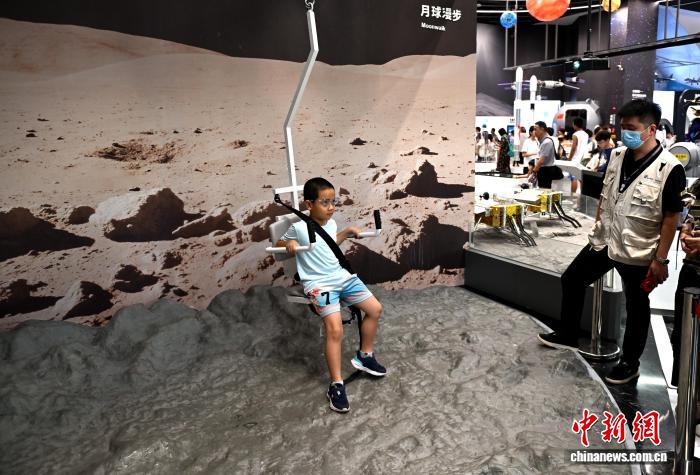 图为小朋友体验月球漫步游戏。中新社记者 吕明 摄
