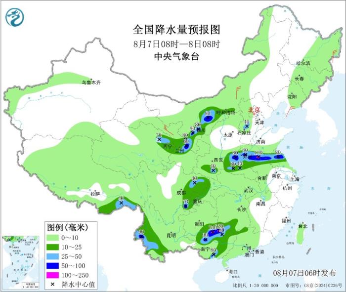 其中,8月7日08时至8日08时,内蒙古河套地区、青海东部、甘肃中部、宁夏中北部、河南中北部、安徽北部、江苏北部、四川盆地东南部、云南西南部、广西北部和东部等地部分地区有大到暴雨,其中,河南东部、安徽北部、广西北部等地部分地区有大暴雨(100~150毫米),上述部分地区伴有短时强降水(最大小时降雨量20~50毫米,局地可超过80毫米)。中央气象台8月7日06时发布暴雨蓝色预警。