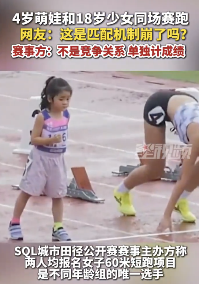 4岁萌娃和18岁女孩同场赛跑。网友吐槽4岁和18岁女孩同场赛跑:“系统没匹配到旗鼓相当的对手”;赛事方回应4岁和18岁女孩同场赛跑:不同年龄组同枪比赛,不是竞争关系,单独计成绩。4岁和18岁女孩同场赛跑非竞争关系#近日,两位年龄差距大的女孩在田径赛场上赛跑的视频在网络发酵,网友用手机游戏语言调侃“系统没匹配到旗鼓相当的对手”。8月7日,赛事主办方负责人告诉@红星新闻记者,这是7月27日SQL城市田径公开赛·长沙站上的比赛画面。参赛选手一名4岁一名18岁,她们均报名女子60米短跑项目,但分别是不同的年龄组。当时两个年龄组别各报了一个运动员,一般来说比赛人数不足是不开赛的,赛事方本着体验服务为主,安排两人同一枪去比赛。但是两人的成绩名次是单独计的,成绩互不影响,两人不存在竞争关系。