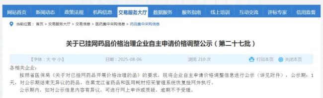 8月6日,黑龙江发布了《关于已挂网药品价格治理企业自主申请价格调整公示》,涉及多个中成药品种,包括牛黄解毒片、肾康宁片、复方丹参片等。其中,此前《中成药风险价格药品目录》点名山东新时代药业的逍遥颗粒,调整前的价格为227元,调整后的价格为185元,降幅为18.5%;辽源誉隆亚东药业的六味地黄丸由调整前的112.05调整到72.5元,降幅为35%