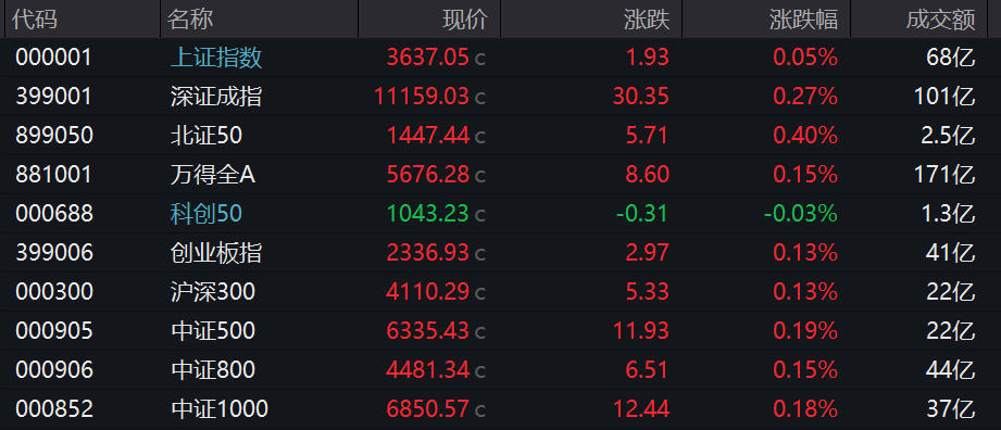 中新经纬8月11日电 11日早间,A股三大指数集体高开,上证指数涨0.05%,报3637.05点;深证成指涨0.27%,报11159.03点;创业板指涨0.13%,报2336.93点。