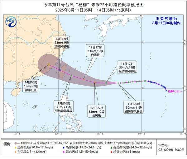 “杨柳”最强可达台风级 将于13日白天在台湾东部沿海登陆