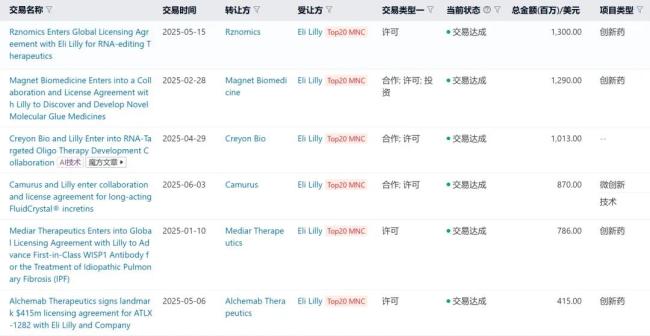 礼来2025年上半年TOP6项目交易(来源:医药魔方NextPharma数据库)