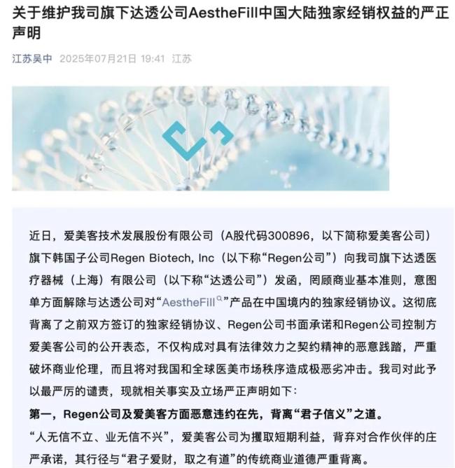 7月21日,江苏吴中在微信公众号发表《关于维护我司旗下达透公司AestheFill中国大陆独家经销权益的严正声明》,指出“Regen公司书面承诺和Regen公司控制方爱美客公司的公开表态,不仅构成对具有法律效力之契约精神的恶意践踏,严重破坏商业伦理,而且将对我国和全球医美市场秩序造成极恶劣冲击。”