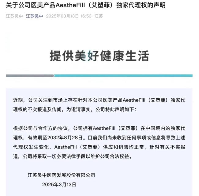 3月13日,江苏吴中微信公众号声明,公司拥有艾塑菲在中国境内的独家代理权,有效期至2032年8月28日。