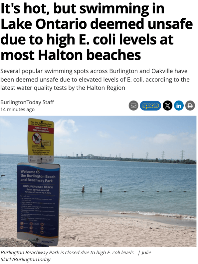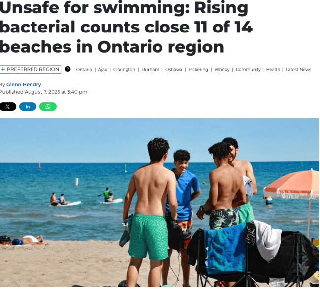 多伦多发出夏日高温警告,但由于每周检测中发现大肠杆菌数量升高,杜林区内14个公共湖滩中,除三个外,其余海滩本周末均已关闭。本周检测结果显示,鲍曼维尔西湖滩是安大略湖上唯一获得合格评级的海滩。另外两个被宣布可以安全游泳的湖滩是比弗顿南海滩和锡姆科湖上的索拉百年公园。由于大肠杆菌数量上升或已达到危险水平,奥沙华的Lakeview Beach东滩和西滩、皮克林的Frenchman’s Bay东滩和西滩、惠特比的Whitby Beach和Iroquois Beach均被判定为不适合游泳。荷顿区也发出同样的警告,Beachway Park、Brant Street Beach以及奥克维尔的多个湖滩也被认定为不适合游泳。8月6日完成的每周例行维护显示,这些湖滩的细菌含量均不安全。在大肠杆菌含量超过卫生部指导标准的水域游泳会增加患病或感染的风险。卫生部门对公共海滩进行监控,以保护游泳者免受疾病侵害。在细菌含量较高的水中游泳可能会感染眼睛、耳朵、鼻子和喉咙,如果吞咽则会引起胃部问题。