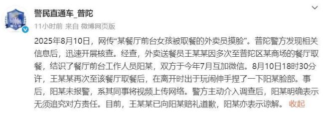 普陀警方随后发布通报,称8月10日接到网传信息后迅速开展核查。经查,外卖送餐员王某某多次到某商场餐厅取餐,结识了前台工作人员阳某,双方于今年7月互加微信。事发当天,王某某取餐后出于玩闹捏了一下阳某脸部。事后阳某未报警,是其同事将视频上传网络。警方主动介入调查后,阳某明确表示无需追究对方责任。目前,王某某已向阳某赔礼道歉,阳某也表示谅解。