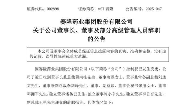 2025年8月10日晚间,赛隆药业公告称,因公司控制权已发生变更,董事长蔡南桂、总裁唐霖、常务副总裁刘达文、副总裁李剑峰、董秘张旭等10位高管集体辞职。