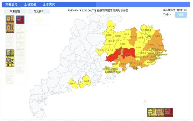 广东气象雷达图显示,大半个广东正受“杨柳”的雨带影响。截至14日7时30分,河源、梅州、汕尾等市的部分地区需要发布暴雨红色预警信号;梅州、揭阳、汕头、潮州等市部分地区需要发布暴雨橙色预警信号;韶关、广州、深圳、江门、阳江等市部分地区则需发布暴雨黄色预警信号。粤东沿海部分市县区自13日夜间起已发布暴雨预警信号,截至14日早晨仍维持。