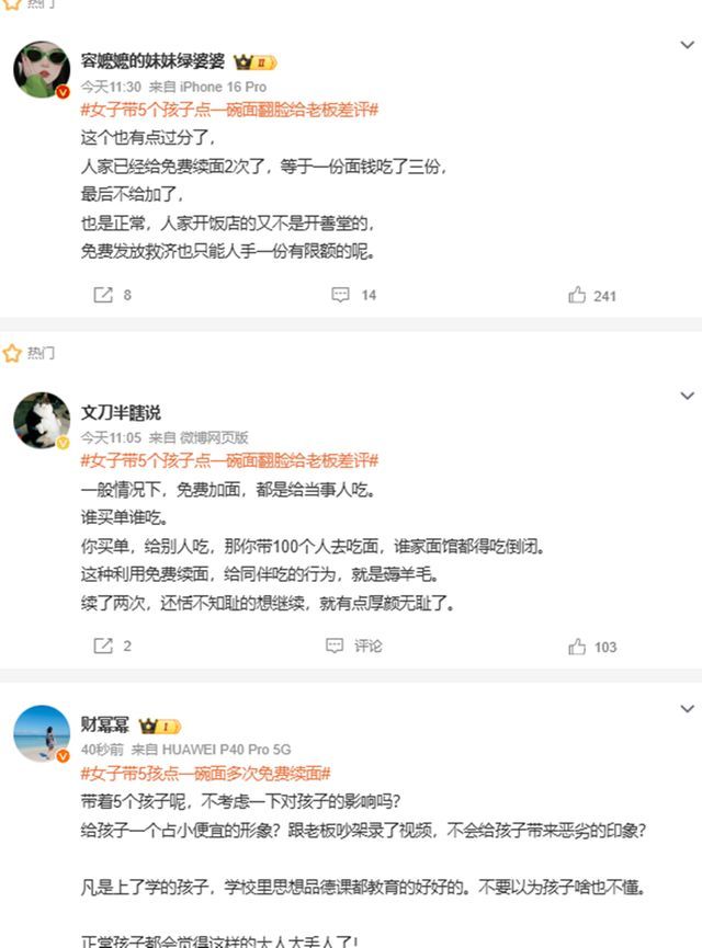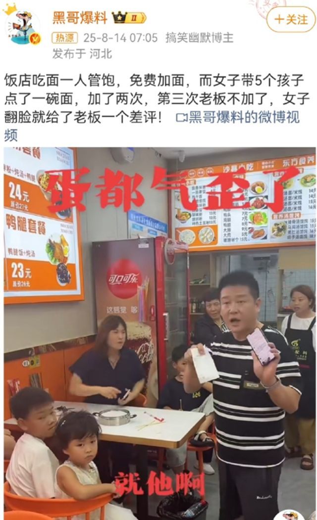 女子带5孩点一碗面多次免费续面 老板忍不了拒绝女子反手差评