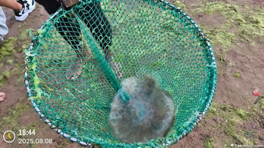 “每年七八月份本就是海蜇高发期。”栈桥海水浴场场长翟涛介绍,今年7月起,浴场防鲨网外围就已出现海蜇踪迹,但当时个体较小。而近一周来,海蜇数量骤增且体型偏大,主要以沙蜇、绵蜇为主。