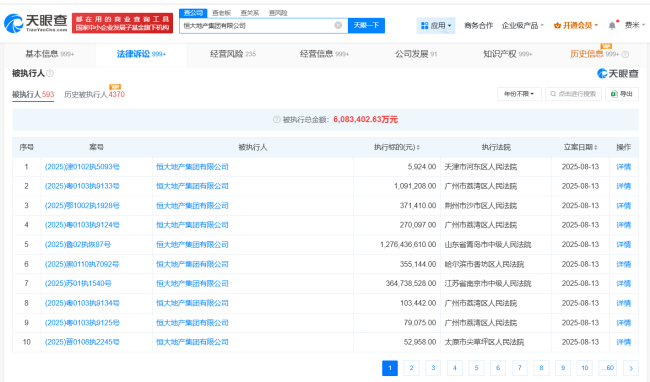根据天眼风险信息,恒大地产集团有限公司目前存在590余条被执行人信息,被执行总金额超过608亿元。此外,该公司还面临多条限制消费令、失信被执行人记录及终本案件信息。