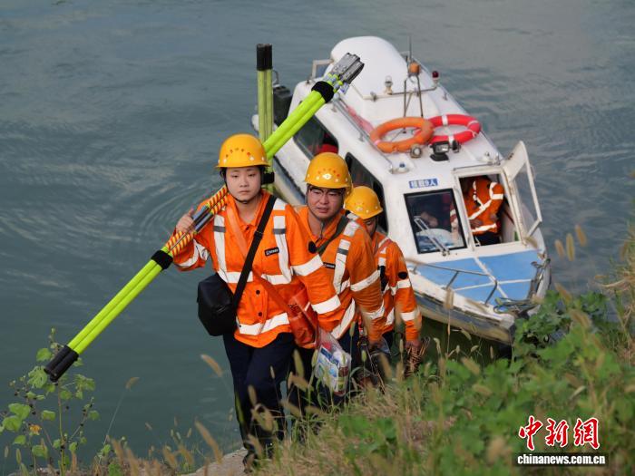 图为工作人员乘船抵达作业点。刘盼利 摄