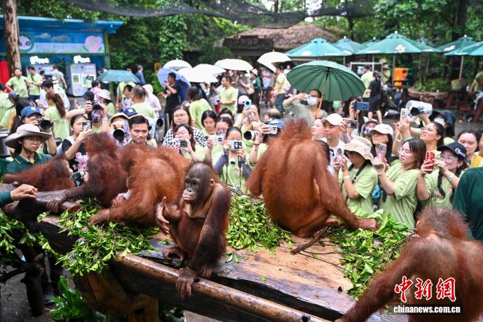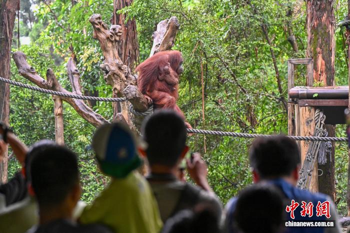 图为红毛猩猩“毛氏家族”成员吸引游客。中新社记者 陈骥旻 摄